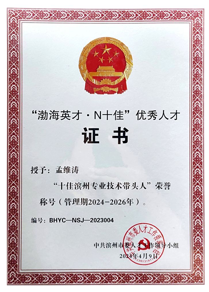 經(jīng)中共濱州市委人才工作領(lǐng)導(dǎo)小組嚴(yán)格評(píng)選,公司員工孟維濤榮獲“十佳濱州專業(yè)技術(shù)帶頭人”榮譽(yù)稱號(hào)。